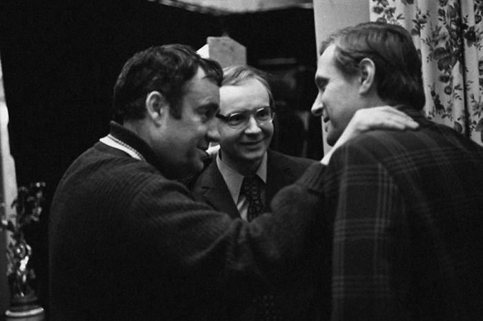"…Репетируем в павильоне. Юра молча наблюдает. Актеры примеряются к декорации. Затем Ливанов и Соломин усаживаются в кресла.