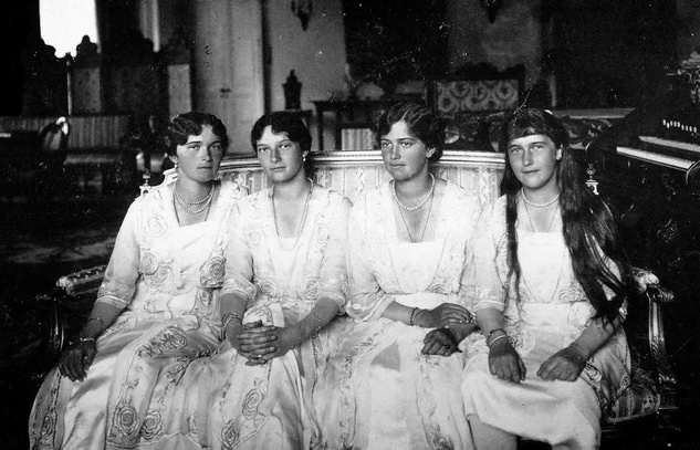 Великие княжны Ольга, Татьяна, Мария и Анастасия Николаевны Романовы во время своей последней официальной фотосессии, 1916 год.