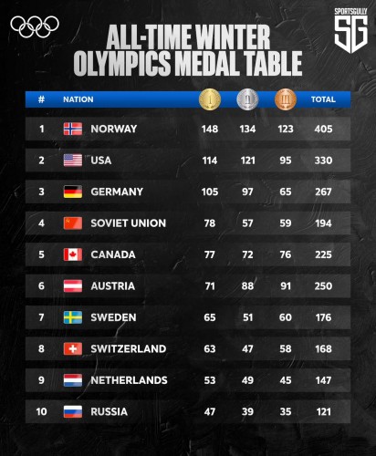 Таблица медалей Зимних Олимпийских игр за всю историю.
