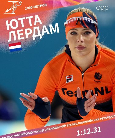 Нидерландская конькобежка Ютта Лердам побила олимпийский рекорд на 1000 метров, который только что установила ее соотечественница Фемке Кок. Лердам преодолела дистанцию за 1:12.31, улучшив результат Кок на 28 сотых секунды! 🇳🇱