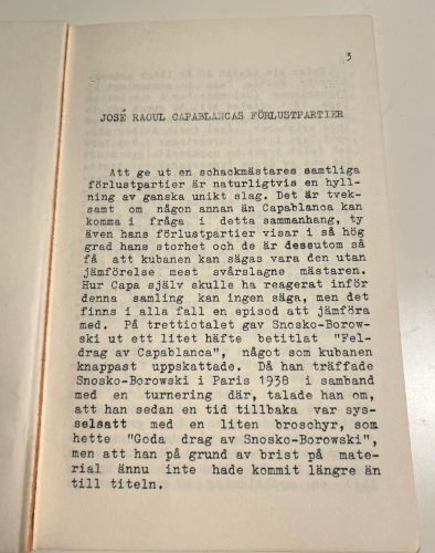 | Это старая книга, изданная в Швеции автором Дж. Э. Вестманом в 1963 году. В ней описаны все турнирные поражения Капабланки за всю его карьеру, и к каждой партии прилагается небольшая предыстория или анекдот. На втором изображении вы видите первую страницу книги. Там описан забавный случай между Капабланкой и Зноско-Боровским. |