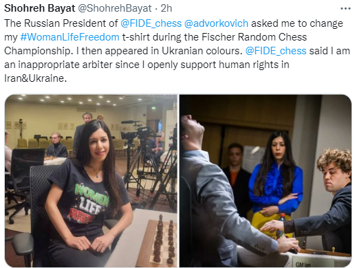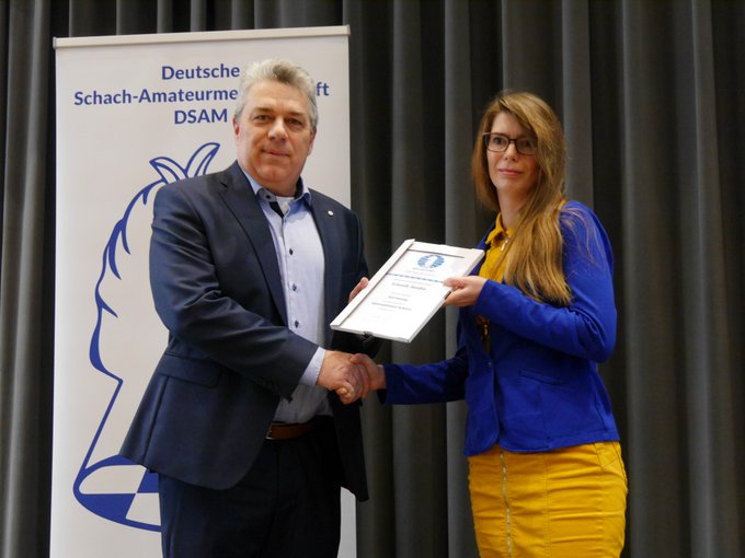 The difference between @FIDE_chess and @Schachbund :While @ShohrehBayat gets punished by the FIDE-president for being dressed in colours of Ukraine, @SandraSchmidt IA today got her International Arbiter Certificate personally from German Chess Federation president @UllrichKrause
