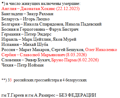 А в ноябре прошлого года было 1874. Память ушедших из жизни в течение последних шести месяцев мы почтили, не пропустив никого. О новых обладателях звания тоже было сказано. Включая такие "нерегулярные" случаи, как присвоение звания победителю чемпионата ASEAN и победителю чемпионата арабских стран. (В самое ближайшее время звание GM будет присвоено и Роману Дегтяреву, ставшему первым в истории чемпионатов Европы победителем в ранге мастера).