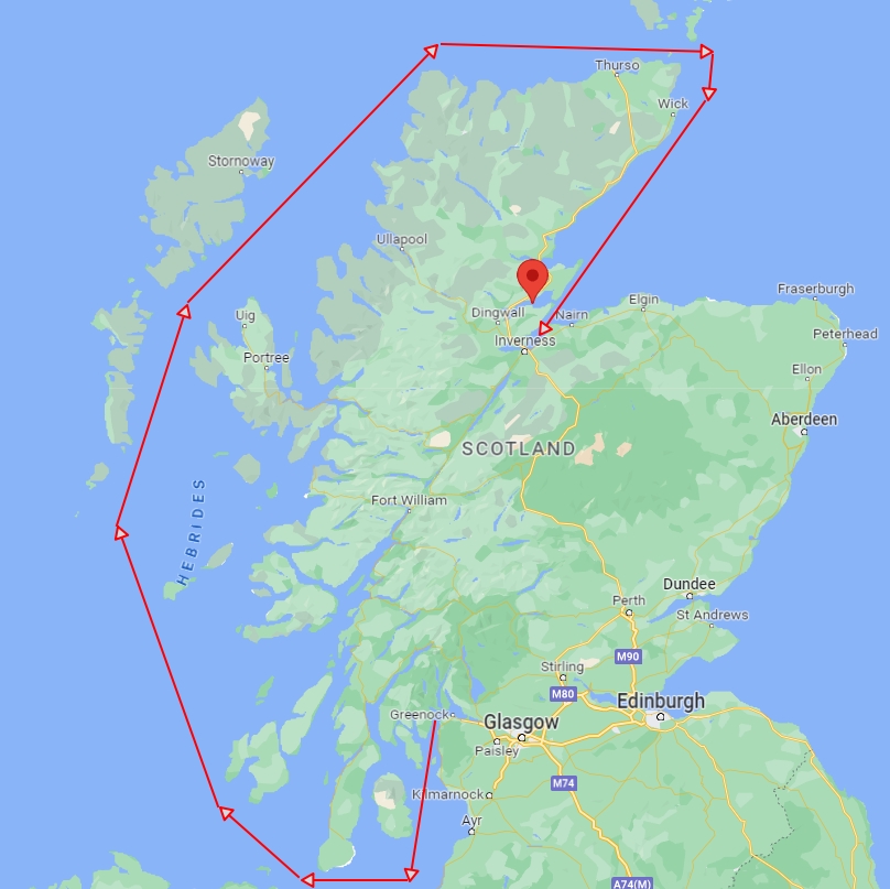 После Глазго состоялся первый большой перегон корабя на противоположную часть Шотландии. Точную траектрию нам не сообщали, а я не отслеживал, но примерно такая: