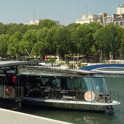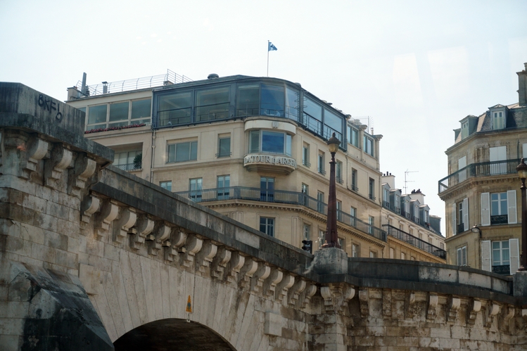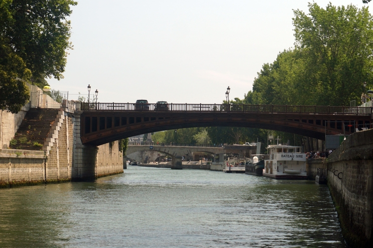 Но потом, когда катер поплыл, настроение все ухудшалось. Выяснилось, что стекла окон никогда не мылись. Невозможно было найти чистое пятно, через которое можно было бы снимать. То есть, нужно было вставать из-за стола, выходить на палубу и там снимать. Но во-первых это же ресторан, там нужно сидеть за столиком, а не ловить объекты съемки. А во-вторых нечего было снимать - Сена вся пересечена мостами и это в основном все, что иы видели - многочисленные грязные мосты. Сама река узкая, и от жары измельчала, панорамы никакой большую часть прогулки. Узкие и высокие берега, иногда, если нет деревьев, были видны макушки обычных зданий.