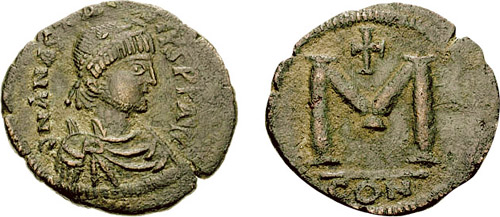 ну и вот, начало 6, столичный (константинопольский то есть) фолис. с портретом, с позволения сказать, самого императора. так теперь и будут жить, еще 1000 лет.