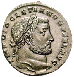 Потемневшая монета императора Диоклетиана (284-305 гг.), отчеканенная в городе Антиохии, открывает новый этап истории Римской державы, последний период подъема. На реверсе изображена мужская фигура с венком и рогом изобилия – гений римского народа (GENIO POPVLI ROMANI). На похожей монете императрицы Елены (матери Константина Великого) (324-329 гг.) виден строгий профиль со сложной прической. На реверсе выразительная фигура женщины с опущенной ветвью: «SECVRITAS REIPVBLICE» (безопасность республики).