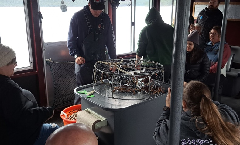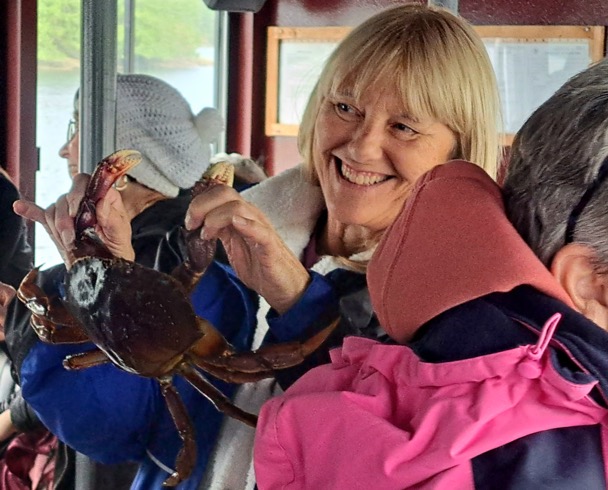 В Кетчикане у нас был выбор либо смотреть шоу-соревнование по распилке вручную бревен и потом кушать крабов, либо кушать крабов и потом прогулка на катере по заливу с демонстрацией как ловят крабов. В любом случае нужно было кушать крабов, и мы выбрали прогулку на катере.