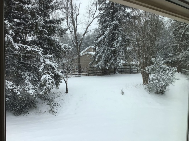«Внемлил» совету. Хотя влагу от ноги отводить не нужно и нашел только один шерстяной носок, но все равно сижу в нем. Дело в том, что у нас вчера вечером серьезно сломалось отопление, а дров для камина нет от слова «совсем», уже несколько лет. А снаружи, как назло, опять дали снег и он будет идти до темноты. Обещают такой же как в прошлый раз (4-6 дюймов). Но думаю, что будет больше, уже сейчас (только 10 утра) такой вид из окна:
