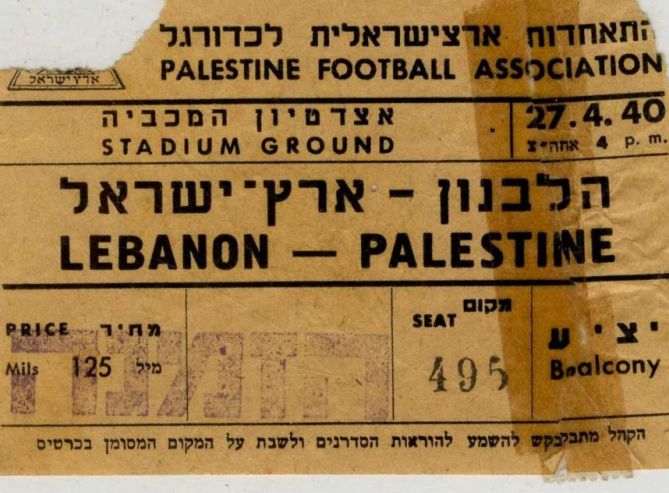 Билет на футбольный матч Палестины с Ливаном (1940). Палестина выиграла 5:1. За команду Палестины забили: Мейтнер, Шнейдерович, Мехлис и два раза Каспи (Серебряный?)