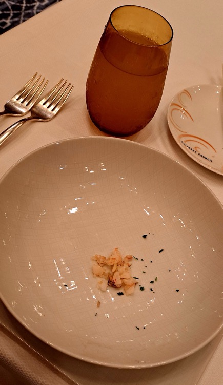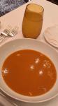Теперь о недостатках. Это был корабль с самой простой кормежкой. И это не потому, что он маленький. Чаще бывает наоборот. На маленьких кораблях поварам проще блеснуть кулинарным искусством. Кроме того, тут не все можно было брать самому, нужно было просить, а эти раздатчики еды были заинтересованы в том, чтобы больше осталось - ведь то, что останется, это их «хлеб». На других кораблях такого отношения не было заметно. Мне часто приходилось просить положить еще один кусочек рыбы или еще одну ложку пюре, и было заметно, что даже это они делали неохотно. А ведь я после двух специфических операций уже привык есть не много и всё равно мне не хватало. Даже большие пустые тарелки пассажирам не разрешали брать, только среднего размера для малых блюд. Большие были у раздатчиков. В конце концов нам это надоело и мы решили питаться не со шведского стола, а в ресторанах, хотя там всегда долго ждать. В бесплатных ресторанах тоже порции были маленькие и тогда мы решили попробовать платный ресторан. Туда удалось записаться только на 9 вечера. Пришли и простояли минут 10 возле столика администратора пока он к нам вышел и усадил нас. Меню было на французском, а свой переводчик я забыл в каюте. Я сначала заказал биск (густой суп из морепродуктов) из раков. Пришел официант, пожелал приятного аппетита, поставил передо мной такую тарелку и удалился.