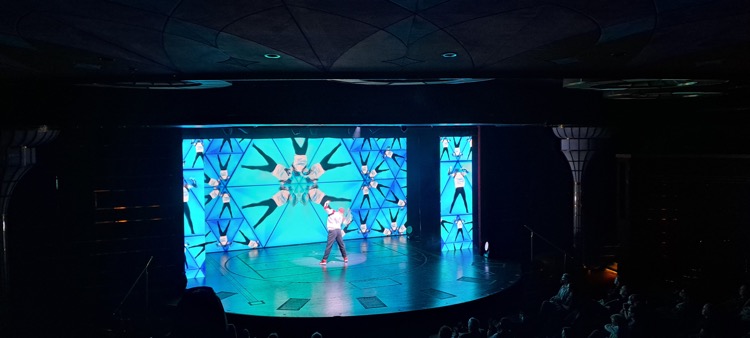 И наконец, очень приличная была развлекательная программа. Мне особенно понравилась смесь современного балета с проекционной лазерной анимацией на экран и пол. Например, танцор крутится на сцене, а на экране крутится 3Д-куб и танцор в него четко вписывается. Пели и играли тоже хорошо, правда, у одного гитариста лопнула струна и он какое-то время обходился без нее, потом отлучился и заменил. Чуть позже я в этот пост добавлю несколько характерных фото со сцены.