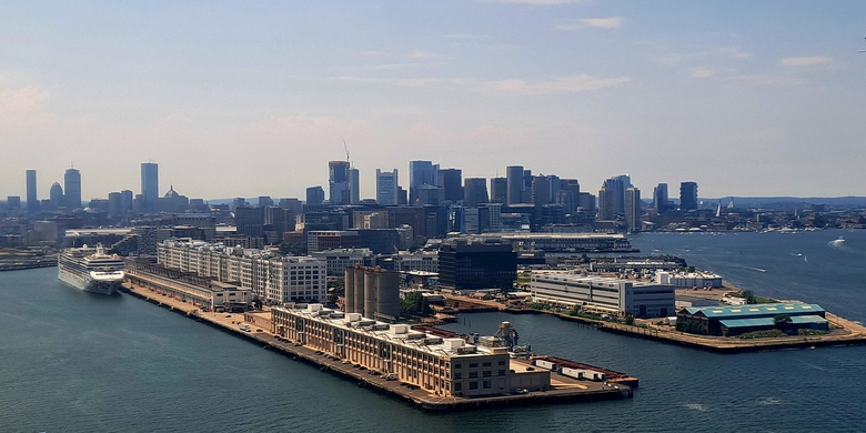 И хорошо, что это сделали, так как программа на телефоне жены упорно заворачивала нас вправо по набережной канала. А мы видели нужное нам здание порта и пирс корабля (корабля еще не было) слева от канала. Район этот ничем не интересен, так что я там не снимал ничего. Поэтому покажу только одно фото Бостона с самолета