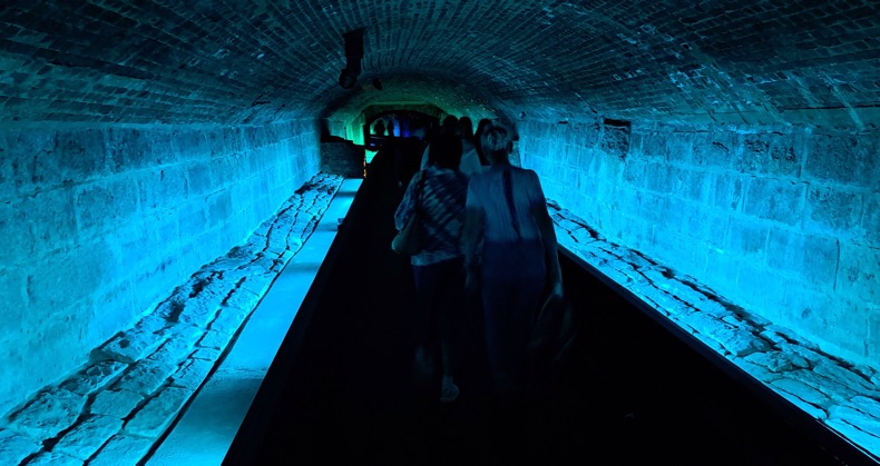 У меня возникло подозрение, что эти Sortie хотят нас провести по всему маршруту залов и лишь тогда будет выход на улицу, но у нас не было на это уже ни сил ни времени. Нужно же было не только срочно выбраться, но и забрать наши рюкзаки из другого здания и потом под дождем быстро искать место сбора автобусной экскурсии. Тут я увидел подземный ход, в синеву которого люди бодро шли толпой. Решив, что этот туннель это то, что и нам нужно, я скомандовал своим женщинам больше не отвлекаться на экспонаты и быстро следовать за мной. И мы шли и шли, все менее бодро, шли и шли, а я уже совсем плелся сзади, почти отключаясь и думая, что этот подземный туннель теперь приведет нас не на белый свет улиц Монреаля, а в древний подземный город или его макет.