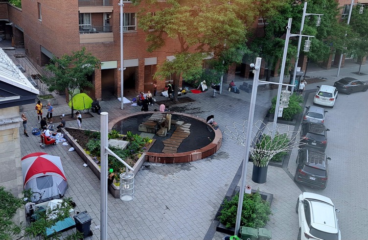 Я уже упоминал, что когда мы искали дом, то в этом районе заметили много бездомных, хотя еще шел мелкий дождь они уже появились на улочках. Но из окон мы наблюдали странную картину, особенно в последующие дни, когда погода наладилась. Рядом с ними в палатках и вне их находилось не меньше, а даже больше нормально одетых людей, некоторые из них приезжали на машинах. Они общались с бездомными, вместе кушали. Я даже сначала подумал, что может в преддверии праздника (1 июля - понедельник, День Канады) тут так принято помогать бездомным, проводить с ними вместе время.