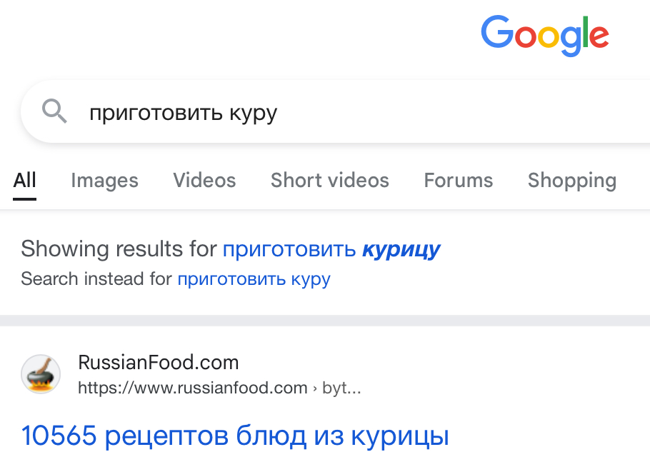 Но сейчас у меня почему-то это не получается. Хотел посмотреть разницу между «приготовить куру « и «приготовить курицу». Сейчас гугл просто бесцеремонно исправляет «приготовить куру» на «приготовить курицу»: