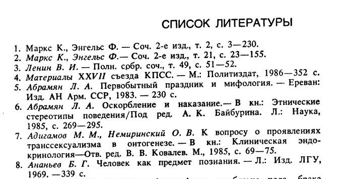 Игорь Поночевный пишет: "В книге Игоря Кона «Введение в сексологию» М., 1989. в списке использованной литературы (и включающей 370 работ) первые три по списку, в соответствии с существовавшими тогда правилами, указывались работы Маркса, Энгельса и Ленина; четвертыми шли (как и полагается в табели о рангах) «Материалы XVII съезда КПСС» и только после этого начиналась вся другая профессиональная литература в алфавитном порядке."