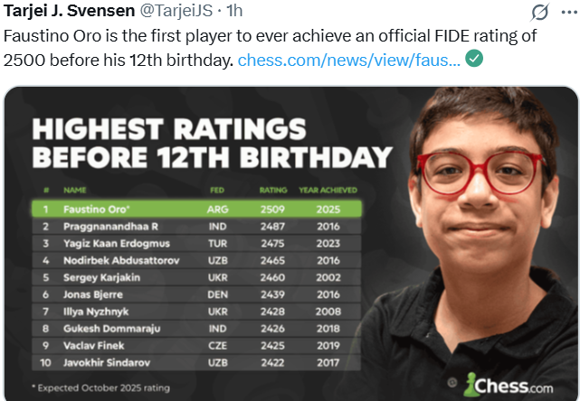 Прошло 25 месяцев, и вот я разговариваю с победителем турнира в Мадриде — самым молодым игроком, когда-либо преодолевшим отметку 2500, и вторым самым молодым, кто выполнил норму гроссмейстера, уступая только Гукешу. Интересно, каким из этих достижений он гордится больше? «Думаю, нормой. Да, выиграть турнир, где почти все участники были гроссмейстерами, а я был лишь шестым сеяным, тоже совсем неплохо. Я также набрал немало рейтинговых очков. Так что да, в целом я очень доволен нормой и своей игрой в целом».