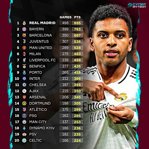 Общая таблица Лиги Чемпионов за всю историю турнира.