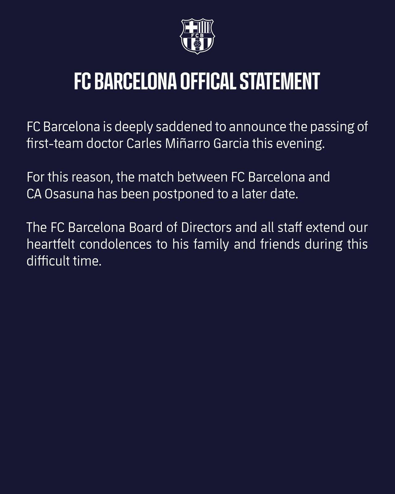 DAZN сообщает, что несколько часов назад скончался член медицинской бригады «Барселоны», работавший с основным составом. Все игроки и персонал в состоянии сильного шока. |
