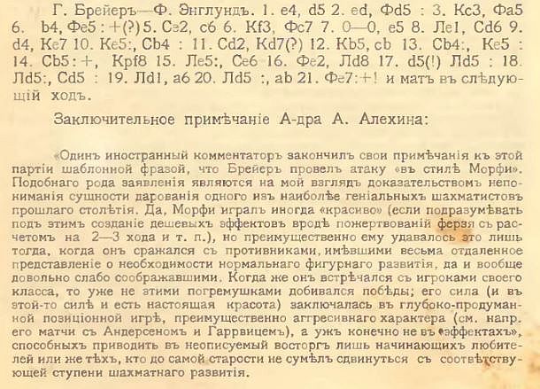 А в 1914-м году с рассуждениями Алехина о "погремушках" не согласился Е.А. Зноско-Боровский. Письмо последнего в редакцию и ответ на него Алехина под заголовком "В защиту Морфи от 'защитника' его" я могу привести, если кому-нибудь здесь это интересно, конечно. |