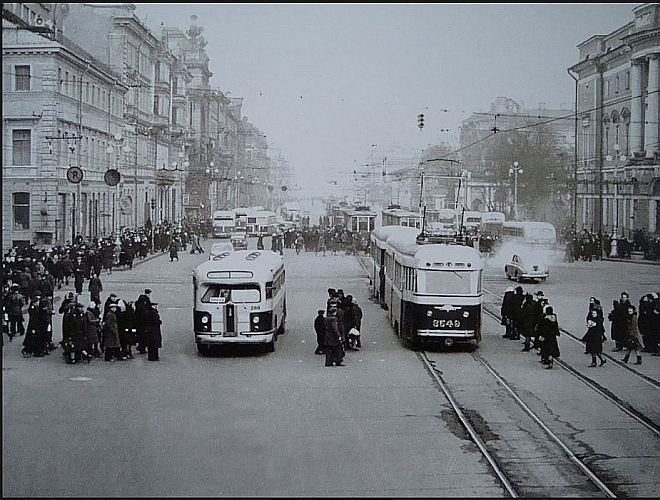 Обратите внимание на трамваи. Несколько лет спустя их уберут с Невского. |