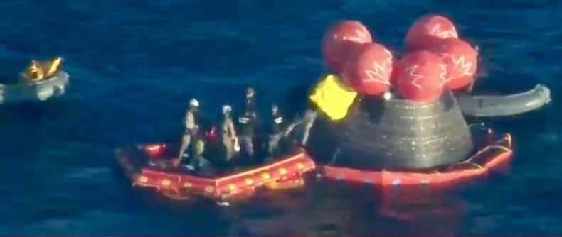 Когда аппарат окажется в воде, вокруг его верхней части надуется система из пяти оранжевых баллонов, которая переведет капсулу в вертикальное положение, чтобы экипаж мог выбраться наружу.