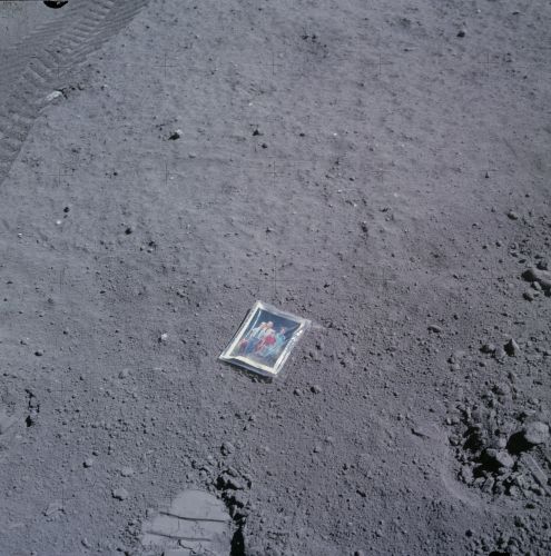 Charlie Duke's family portrait left on the surface of the moon. Cat Crater at Station 14 was named for sons Charles And Tom. Dot Crater at Station 16 was named for his wife.