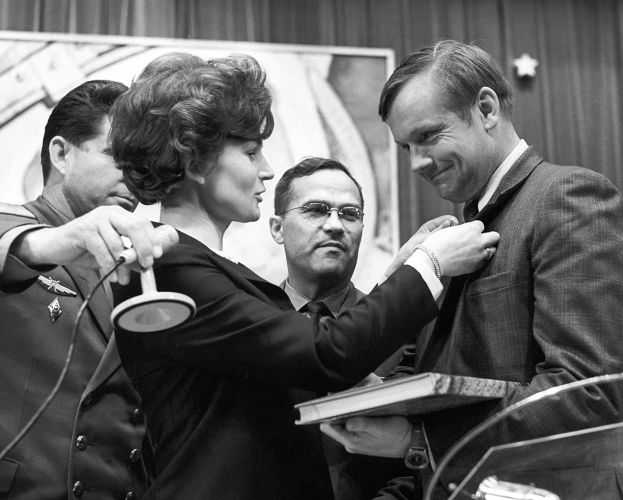Валентина Терешкова (первая женщина в космосе и героиня советской программы) награждает Армстронга в Москве.