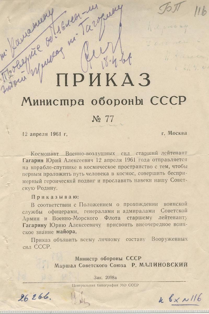 Приказ министра обороны СССР Маршала Советского Союза Р. Малиновского о присвоении космонавту Военно-воздушных сил старшему лейтенанту Юрию Гагарину внеочередного воинского звания майора. 12 апреля 1961 г.