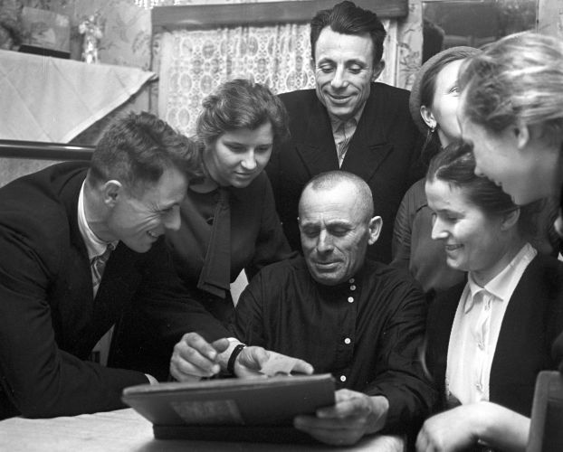Семья Гагариных. Слева направо: Борис Алексеевич — брат Юрия Гагарина; Аза — жена Бориса; Валентин Алексеевич — брат Юрия Гагарина; Зоя Алексеевна — сестра Юрия Гагарина; Антонина Савельевна — двоюродная сестра Юрия Гагарина; и Тамара — дочь Зои Алексеевны. В центре: Алексей Иванович Гагарин — отец Юрия Гагарина. Гжатск. Апрель 1961 года. Фото: Юрий Абрамочкин.