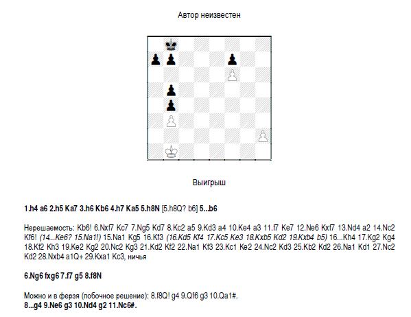 Вся беда в том, что я знаю кто автор этого этюда. Но я не знаю, какое авторское решение или белые выигрывают, или здесь все таки ничья. Не смею опубликовать фамилию автора пока родственники не дадут согласие.