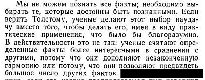 | Т. Пуанкаре Толстого понять не потрудился(в самом деле, чувствовать себя проституткой бандитов несколько неприятно, куда приятней чувствовать себя жрецом истины), и начал опровергать то, что ему захотелось приписать Толстому. Пуанкаре,как уже сказано, понять можно. Но зачем это ... цитировать - решительно непонятно. |