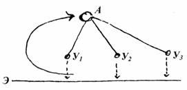Здесь аксиомы A – основные понятия и законы теории – “свободные изобретения человеческого духа, не выводимые логически из эмпирических данных”. Аксиомы эти изобретает интуиция, взлетающая (дугообразной стрелой), оттолкнувшись от почвы эмпирики Э. Из аксиом логически выводят конкретные утверждения У, которые приземляют – сопоставляют (пунктирными стрелками) с данными наблюдений Э. |