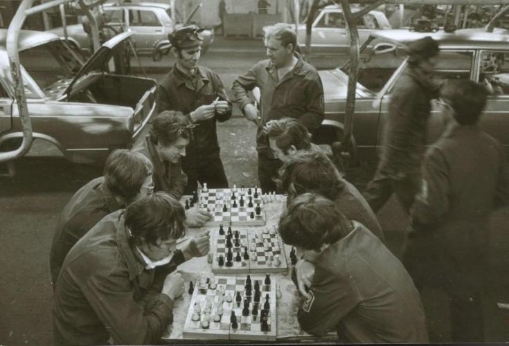 Рабочие Волжского автомобильного завода играют в шахматы. Тольятти, 1981 год.