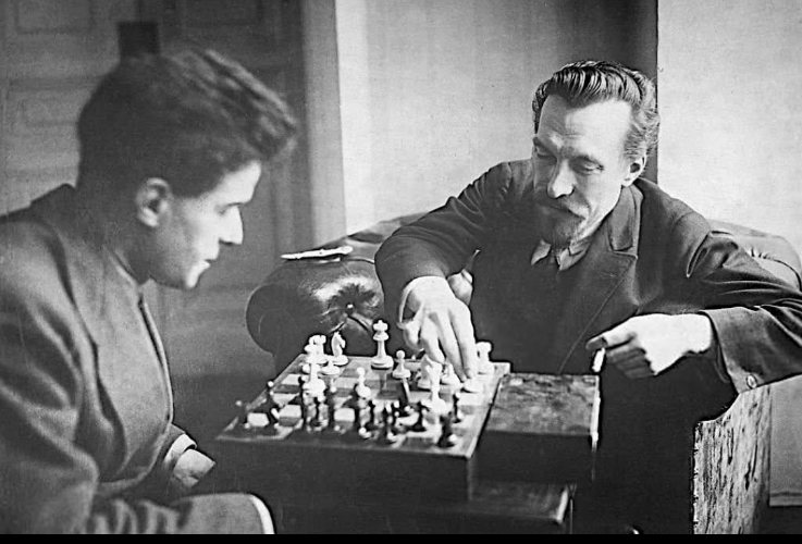 Это фото 1920 года показывает неопознанного молодого мужчину, играющего в шахматы с Алексеем Рыковым. Рыков стал председателем Совета Народных Комиссаров СССР после смерти Ленина в 1924 году и занимал этот пост до 1930 года. В 1938 году Сталин расстрелял его во время Большого террора.