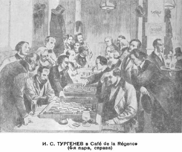 | В Париже Тургенев был частым посетителем знаменитого Café de la Régence, который в 60-х годах являлся центром шахматной жизни Парижа. Здесь Тургенев имел возможность познакомиться с такими крупными шахматистами, как Морфи, Колиш. С Колишем он даже решился играть на равных. „Перед обедом хожу играть в шахматы в Café de la Régence, и претерпеваю частые поражения“446, — писал Тургенев 20 января 1860 года своей знакомой В. Я. Карташевской. В конце 1861 года Тургенев сообщал графине E. Е. Ламберт: „Играю в шахматы,слушаю хорошую музыку. ..“447 и, наконец, в феврале1862 года Тургенев опять писал В. Я. Карташевской: „Выезжаю мало и ничего не работаю: большей частью играю в шахматы“448. |