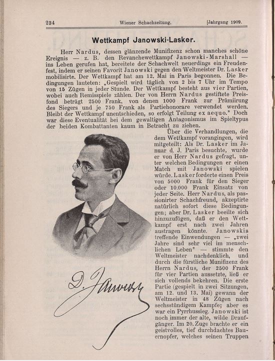 Господин Нардус, чья блестящая щедрость уже подарила миру шахмат много замечательных событий, например, реванш Янковский — Маршалл, вновь устроил праздник для шахматного сообщества, мобилизовав своего фаворита Янковского для матча против чемпиона мира доктора Ласкера. Матч начался 12 мая в Париже. Условия были следующими: «Игра ведётся ежедневно с 2 до 7 часов вечера с темпом 15 ходов в час. Матч состоит из четырёх партий, причём ничьи тоже учитываются. Призовой фонд, предоставленный господином Нардусом, составляет 2500 франков, из которых 1000 франков предназначены для награждения победителя, а по 750 франков — в качестве гонорара за партию. Если матч закончится вничью, призы делятся поровну». Однако при столь сильном антагонизме в стиле игры обоих соперников эту возможность едва ли можно было рассматривать всерьёз.