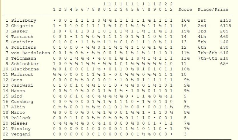 Вергани, Стейниц, Чигорин, Ласкер, Пильсбери, Тарраш, Мизес, Тейхман.