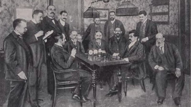 Фото из Шахматного ежегодника за 1908 год. Тарраш и Ласкер во время матча. Мюнхен, 1908