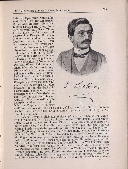 Вдохнуть новую жизнь в старую формулу — таков смысл и внутреннее оправдание следующих строк. Внешним поводом для этого служит 60-летний юбилей Ласкера, внутренним — наше восхищение и почтение к великому мастеру.