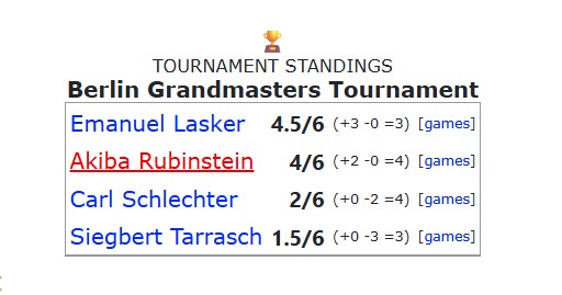 В 1918 году, ближе к концу войны, Бернхард Каган организовал несколько шахматных турниров в Берлине, Германия. Среди них был гроссмейстерский турнир, проходивший в Керкау-Паласте с 28 сентября по 11 октября. В двухкруговом турнире приняли участие четыре известных шахматиста: чемпион мира Эмануэль Ласкер, бывший претендент на мировую корону доктор Зигберт Тарраш, потенциальный претендент на титул Акиба Рубинштейн и бывший претендент Карл Шлехтер.