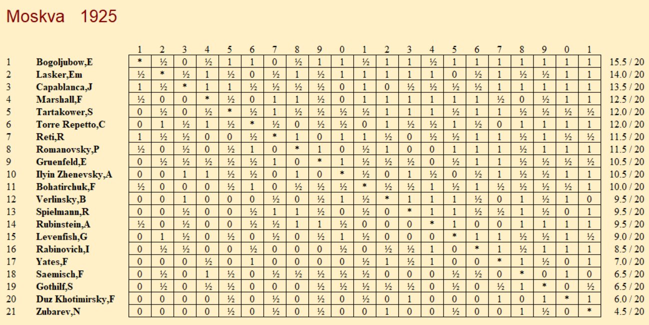 | Тяжёлые дни для Капабланки! Сегодня, в Москве 1925 года, он быстро получил проигранную позицию против Верлинского. Только вчера он играл шестичасовой сеанс одновременной игры в Ленинграде (+18 =8 –4), в том числе проиграв 14-летнему Ботвиннику. За несколько дней до этого он знаменитым образом проиграл Ильину-Женевскому. |