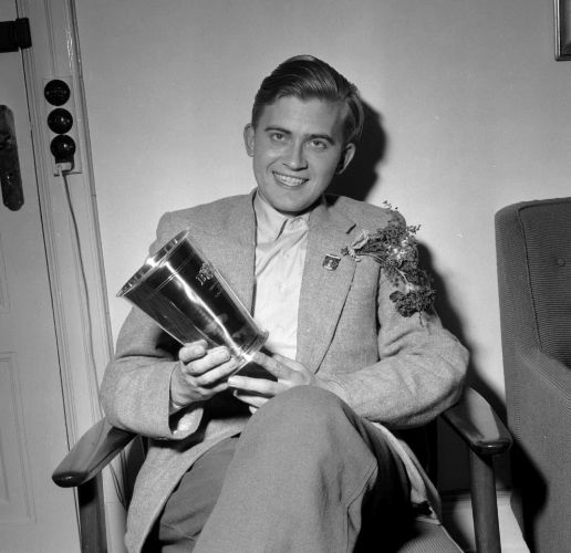 Бент Ларсен, на фото в Дании через несколько дней после получения звания гроссмейстера за выступление на 12-й шахматной Олимпиаде в Москве, 1956 год. Ларсен набрал 14/18, сыграл вничью с Ботвинником и получил золотую медаль за лучший личный результат на первой доске.