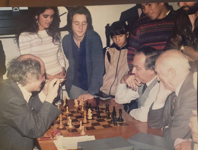 | Отличная фотография из Буэнос-Айреса, 1991 год. Я пытаюсь выяснить, кто ее автор. На ней видно, как Михаил Таль объясняет Оскару Панно, что он запланировал против ...f6. Среди зрителей — Мигель Найдорф, Хулио Гранда и молодой талант Уго Спангенберг. |