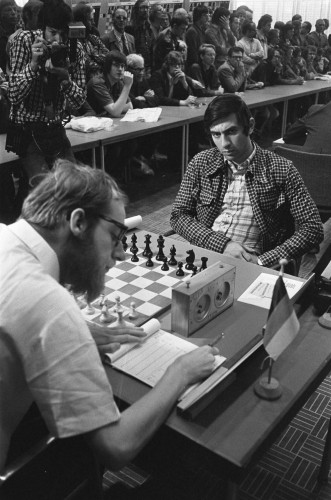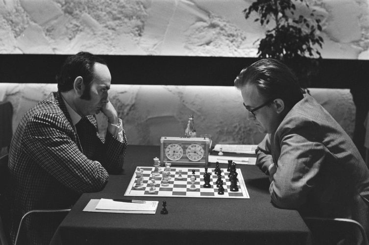 Виктор Корчной наблюдает за партией Яна Тиммана против Пола Боерсмы. |