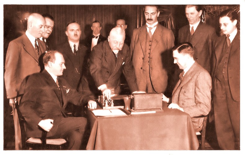 Начало первой партии матча за звание чемпиона мира между действующим чемпионом Александром Алехиным (слева) и претендентом Максом Эйве (справа). Матч проходил с октября по декабрь 1935 года и охватил 13 разных городов Нидерландов. Большинство партий сыграли в Амстердаме. Первую партию матча выиграл Алехин, сделав 30 ходов. Несмотря на ужасное начало (отставание в три очка к 10-й партии), Эйве проявил удивительную стойкость, собрался с силами и в итоге выиграл матч и заветное звание чемпиона мира.