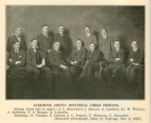 А. Алехин (третий справа в первом ряду) среди монреальских шахматистов в декабре 1923 года.