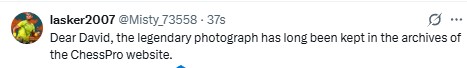 Написал Дэвиду, что легендарная фотография давно находится в фотогалерее сайта ChessPro. Шахматный мир использует это фото, не зная, где искать первоисточник.