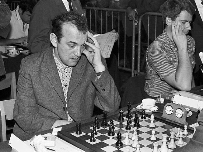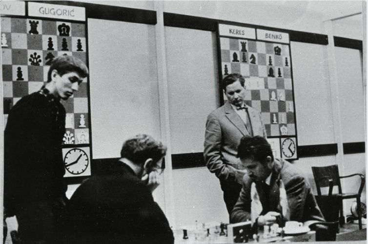 | Турнир претендентов 1959 года (Блед / Загреб / Белград), 12-й тур. Фишер и Керес (который уже выиграл у Бенко за 21 ход) наблюдают за партией Смыслов — Глигорич. |